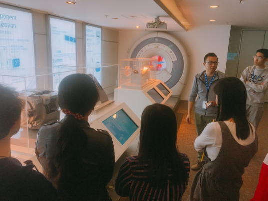 接下来,同学们进入了二楼展厅, 探秘全球顶尖的医疗设备。GE医疗在医学成像、信息技术、医学诊断、病人监护以及生命支持系统、疾病研究、药品开发、生物药品生产技术的专业技术处于全球领先地位,致力于更早地发现疾病,并帮助治疗。首先进入同学们视野的是一台CT样机,这台CT样机正是GE公司最新推出的64排128层Light Speed螺旋CT,其速度快、精度高、配置全,图像高度清晰。1秒钟扫描一个器官,5秒钟扫描完心脏,10秒钟可以扫描全身,具有无创、高效、精确、智能、立体等特点。其采用“0”键工作站、Intel四核处理器技术、直接3D扫描等全球最新技术,且具有层数多、检查项目多;快速、高分辨;高清图像质量;X线辐射低;心脏检查质量优五大优势。工作人员还提到,这台世界顶尖的CT机正是中国的GE工程师们自主研发制造的,在场的同学们不禁发出由衷赞叹和感到无比自豪。 随后,同学们继续参观了核磁共振仪,其设计更为精巧。此外在这间展厅里,还有一项摸不着的新技术——GE云医疗。借助人工智能以及互联网技术,即便是偏远地区的患者,也能在第一时间得到准确的诊断, 各大医院也能通过云医疗系统实现资料共享。