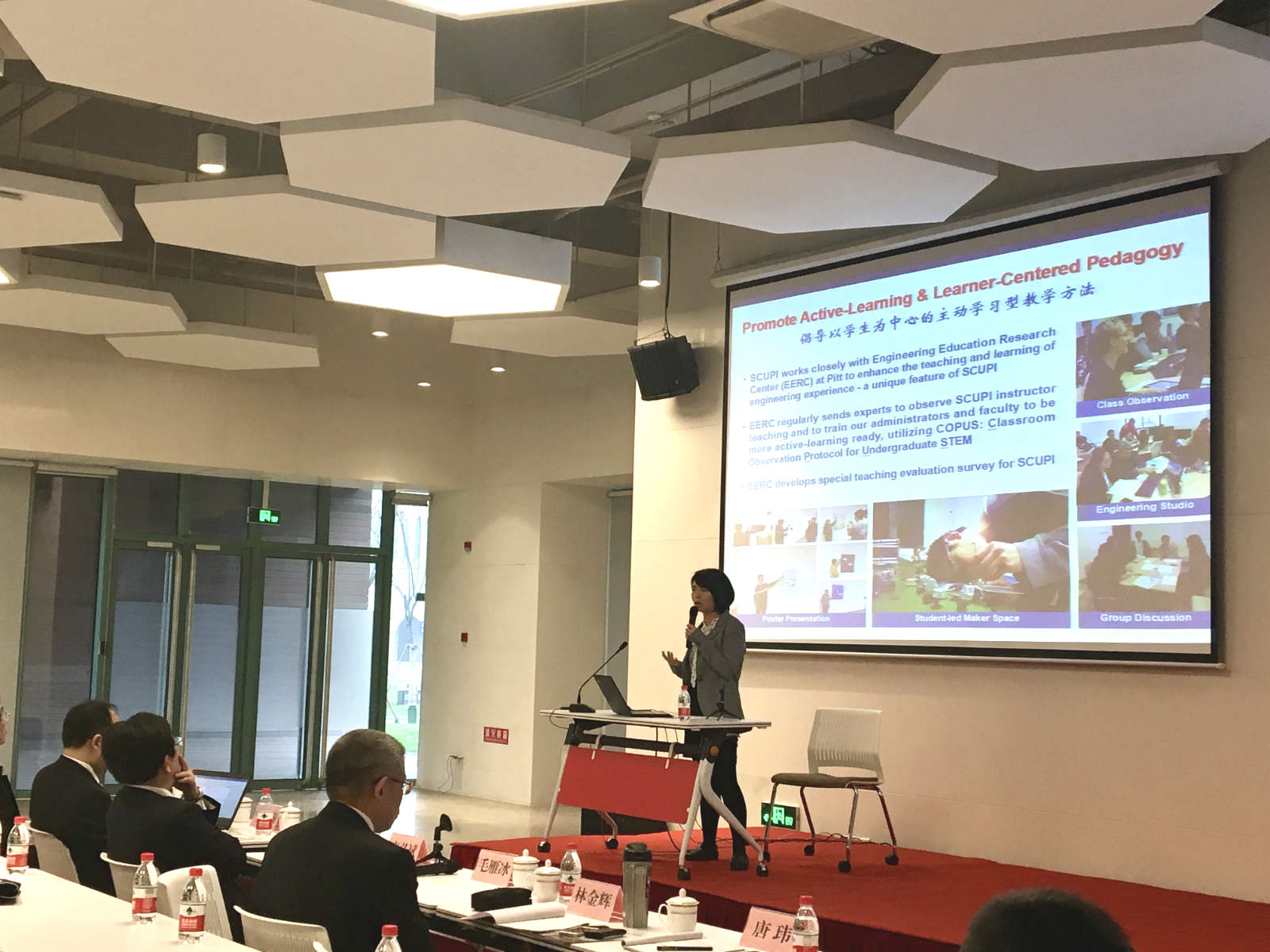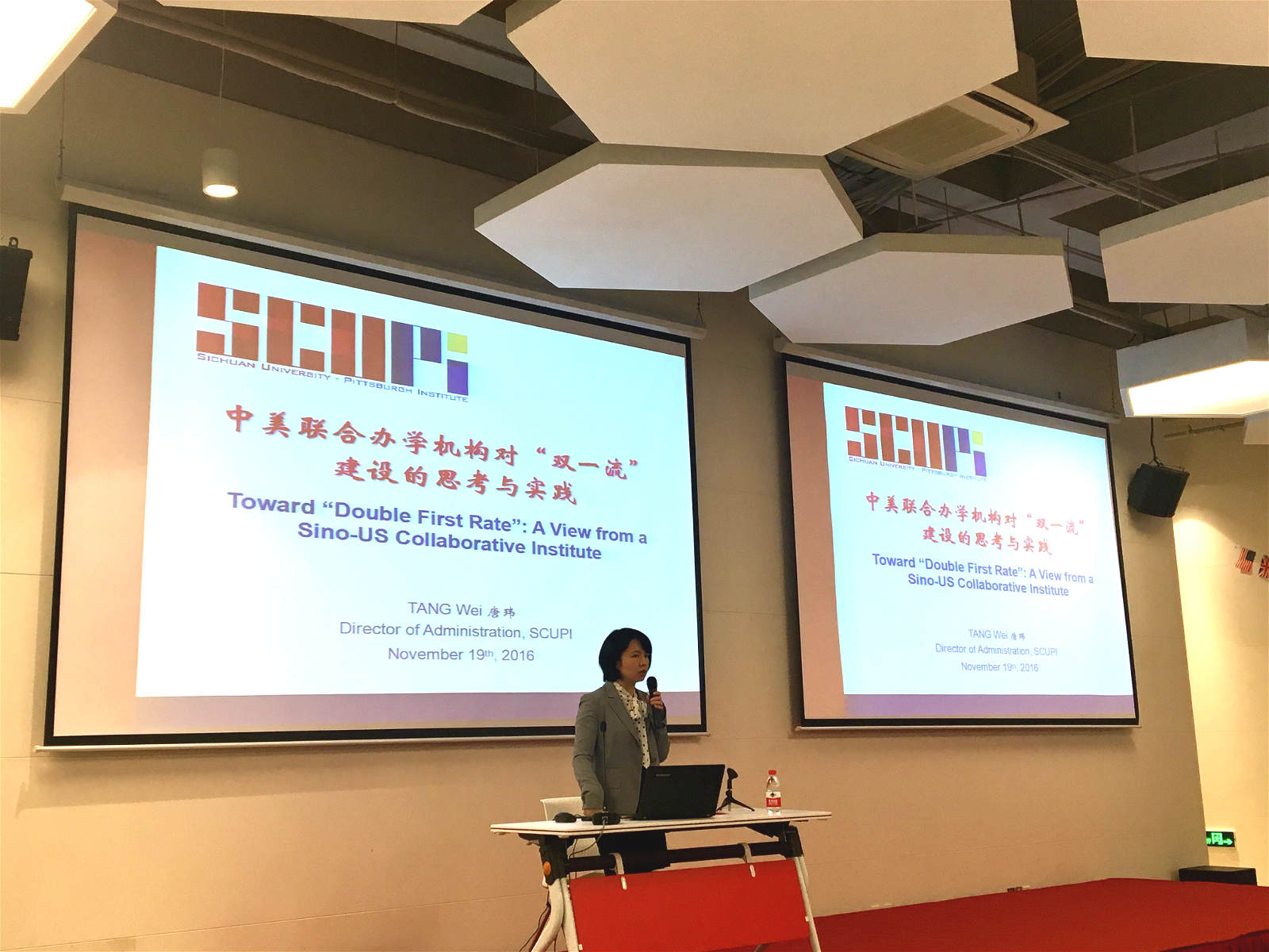 The Inaugural Academic Annual Meeting of IEC, CSEDS, November 29, 2016 Haining The annual meeting was themed as “opening up China’s education to the outside world properly, advancing the internalization of ‘double first-rate’ construction.” The President of Peking University, the Dean of the Shenzhen Graduate School of Tsinghua University, and the Executive Vice President of Zhejiang University made keynote speeches regarding higher education management transformation, international development strategy, and China-foreign joint collaborations; experts from MOE briefed and interpreted recent publicized policy about opening up China’s education to the outside world in depth. Vivi (Wei) Tang, Director of Administration of SCUPI was invited as a guest speaker to the meeting, presented a report titled “Toward ‘Double First Rate’: a View from a Sino-US Collaborative Institute” in one of the trilogy forums. Ms. Tang shared SCUPI’s strategic mission and features, especially elaborated on how to promote active learning and learner-centered pedagogy theoretically and practically from the perspective of establishing world class disciplines as an engineering collaborative institute. In addition, Ms. Tang summarized highlights of keynote speeches delivered on last weekend’s SCUPI-organized and Blackboard China-sponsored “double first rate” symposium in Chengdu, covering quality education, optimization of administrative mechanism, and rethinking the relationship between research, industry, university ranking, and advancement of technological innovation.
